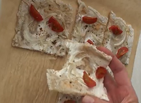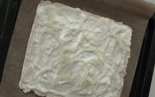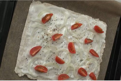 - 水切りヨーグルトをぬり、玉ねぎとプチトマトをのせ、塩コショウ、ナツメグをふります。