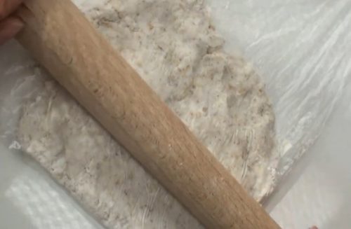 - 袋にオートミールとお湯を入れ、5分ほどそのままにします。オートミールをつぶすように混ぜ、そこに米粉と塩ひとつまみを入れ、手でこねます。生地をまるめて、30分ぐらいねかせます。