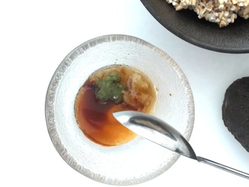 小皿にわさび、おろしたにんにく、しょうゆ、みりんを入れ、たれを作ります。
