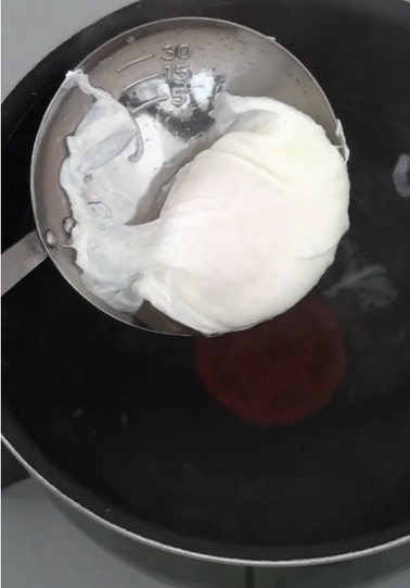 - 卵をカップなどの器に割り入れます。小鍋でお湯を沸かし、酢を入れます。お湯を箸でぐるぐる渦をつくり、中央に卵をそっと入れます。蓋をして、3分ほど加熱します。卵が固まったら冷水にとり、水気を切ります。