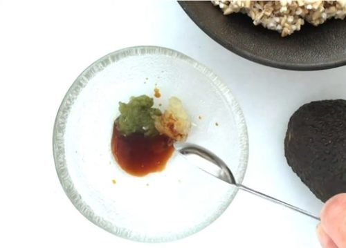 - アボカドは皮をむき、種を取り、角切りにします。小皿にわさび、おろしたにんにく、しょうゆ、みりんを入れ、たれを作ります。アボカドにたれを加え、軽く混ぜます。