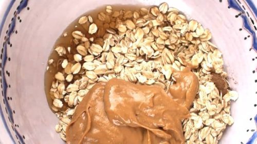 - ボウルにオートミール、ピーナッツバター、メープルシロップ、シナモンパウダー、溶かしたココナッツオイルを入れ、よく混ぜ合わせます。オートミールの生地がぱさぱさしすぎているようであれば、まとまる程度にメープルシロップまたはピーナッツバターを少しずつ追加します。