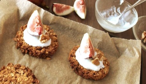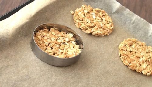 - クッキングペーパーを敷いた天板にオートミールの生地を円形にのせ、スプーンで中央をくぼませます。180℃に予熱したオーブンで、15~20分、黄金色になるまで焼きます。