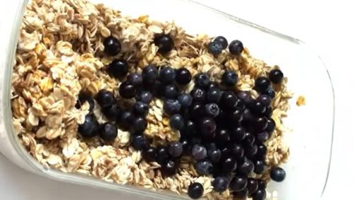 - できあがったオーバーナイトオーツに、ブルーベリー、メープルシロップ、ココナッツオイル、重曹、シナモンを加え、混ぜ合わせます。