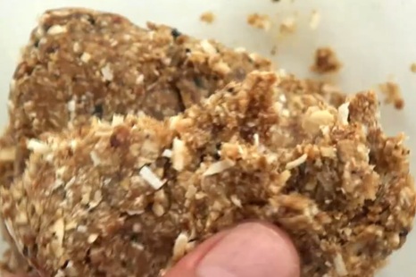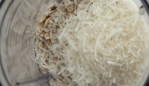 - ロールドオーツ、ココナッツファイン、アーモンド、黒ごま、種を取り除いたデーツをブレンダーで混ぜ合わせます。