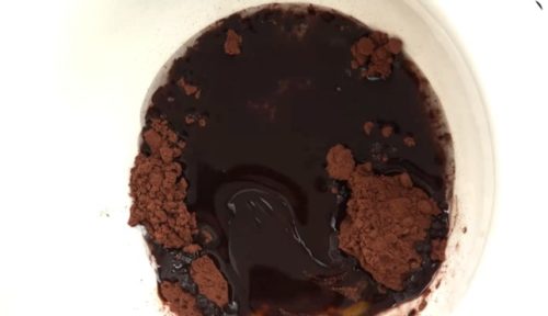 - 溶かしたココナッツオイルに、カカオパウダーとはちみを加え、よく混ぜ合わせます。