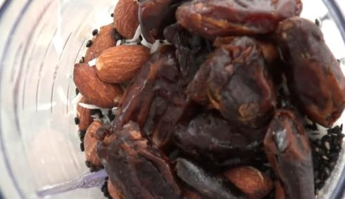 - ステップ1材料を準備するロールドオーツ、ココナッツファイン、アーモンド、黒ごま、種を取り除いたデーツをブレンダーで混ぜ合わせます。