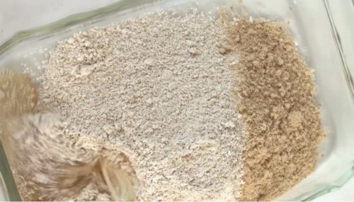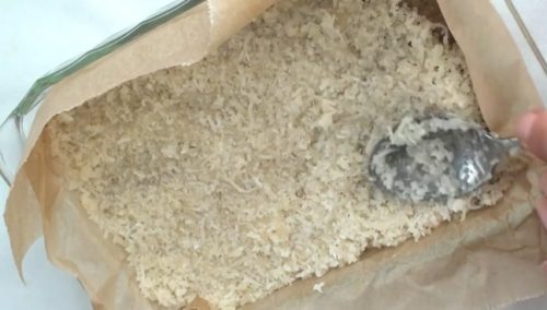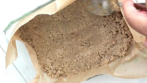 - オーツ粉、ココナッツオイル、ブラウンシュガーを混ぜ合わせます。クッキングペーパーをしいた皿にしっかり押し付けます。