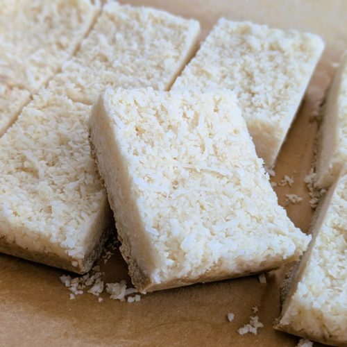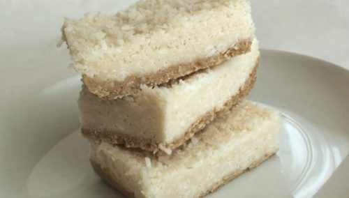 オートミールのクラストにココナッツファインをのせて固めた、焼かずに作るバーのレシピの紹介です。