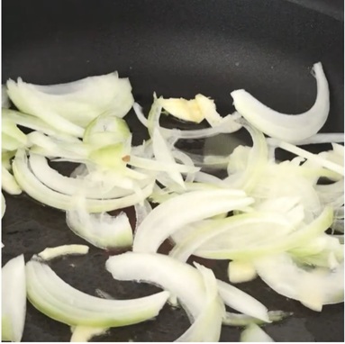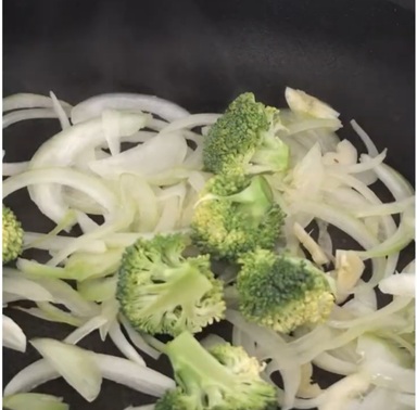 • オリーブオイルをしいたフライパンで、にんにくと玉ねぎを炒めます。オリーブオイルをしいたフライパンで、ニンニクと玉ねぎを炒めます。ブロッコリー、しめじを加え、炒めます。