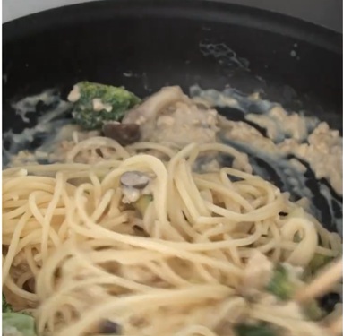 • ゆであがったパスタをクリームソースと混ぜ合わせます。