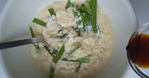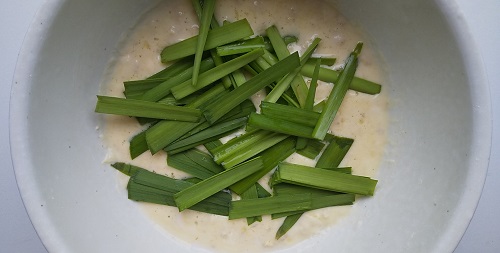 - Leave it and cut the garlic chives into 5 cm lengths. While you are cutting the garlic chives, the oatmeal becomes moist.