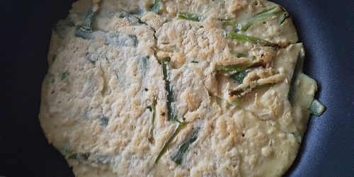 I added oatmeal to this Korean type savoury pancake with garlic chives.