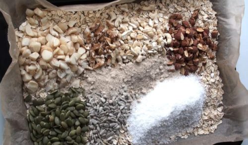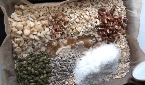 - ステップ2材料を混ぜるクッキングペーパーをしいた天板に、オートミール、ナッツ、ココナッツファイン、かぼちゃ&ひまわりの種、きび糖を入れます。