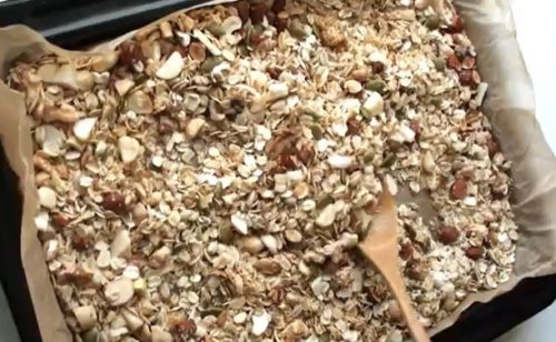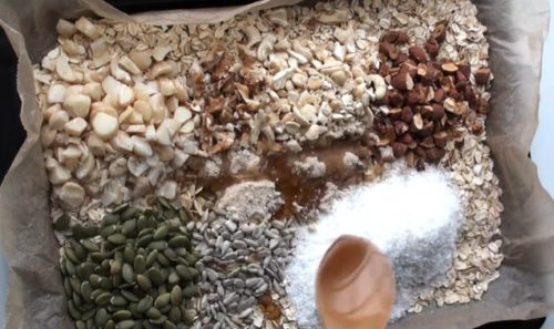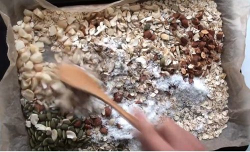 - クッキングペーパーをしいた天板に、オートミール、ナッツ、ココナッツファイン、かぼちゃ&ひまわりの種、きび糖を入れます。メープルシロップとココナッツオイル、塩を加え、混ぜ合わせます。