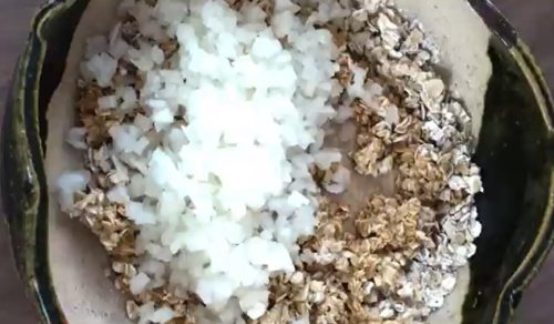 • ボウルにクイックオーツを入れ、お酒、みりん、しょうゆを加え、混ぜ合わせます。玉ねぎを加え、よく混ぜます。