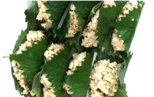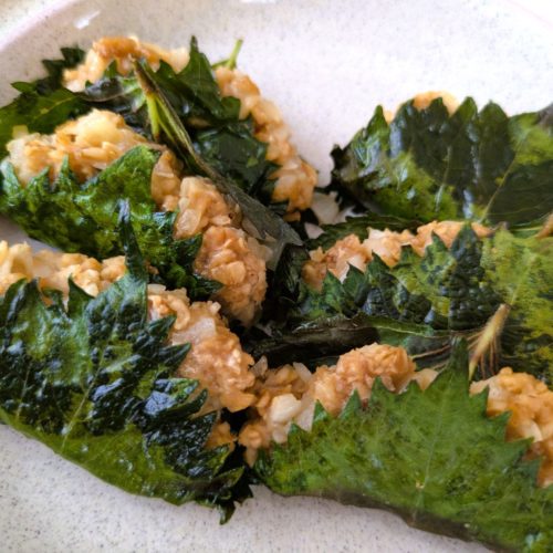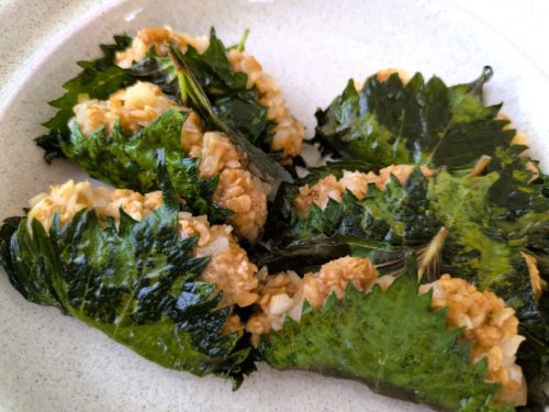 オートミールと玉ねぎを大葉にはさんだだけですが、ボリューム満点。簡単にできあがります。