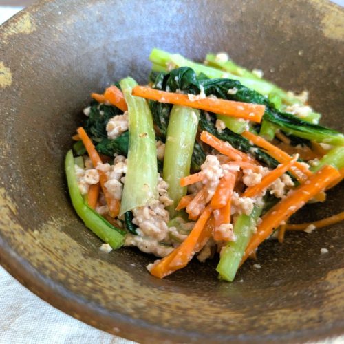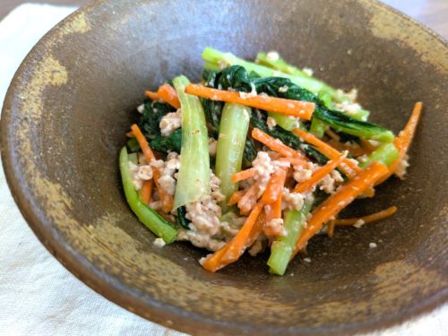 - 小松菜は根元を切り落とし、3㎝ぐらいに切ります。にんじんは皮をむき、細切りにします。小松菜とにんじんを耐熱ボウルに入れてラップをかけ、600Wの電子レンジで2分加熱します。