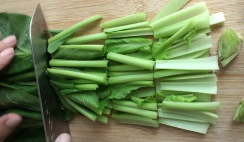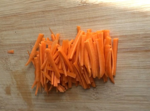 - ステップ1野菜を準備する小松菜は根元を切り落とし、3㎝ぐらいに切ります。にんじんは皮をむき、細切りにします。