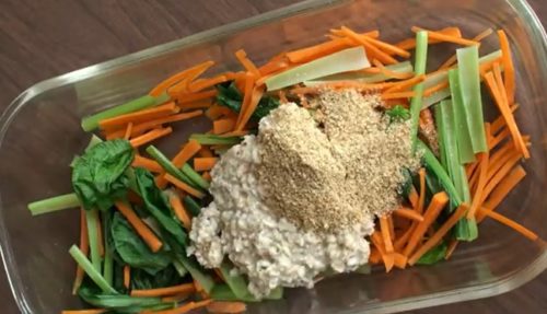 - 野菜の租熱をとり、オートミールを加え、すりごま、しょうゆ、みりんを入れて混ぜ合わせます。