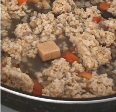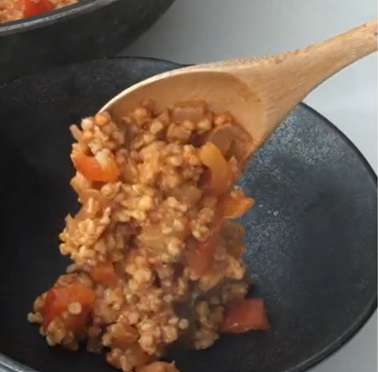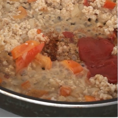 - オートミールを入れて混ぜ、さらに、トマトソース、コンソメスープの素、スパイスを加えて、ひと煮立ちさせます。塩コショウで味を調えます。
