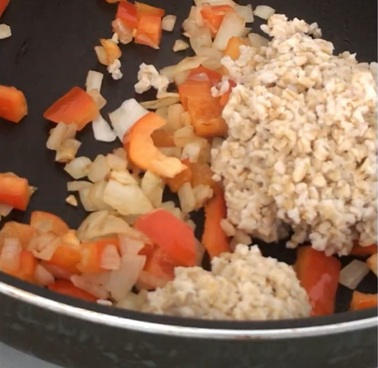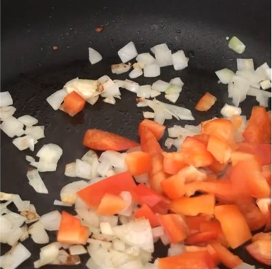 - フライパンに油を熱し、みじん切りにしたニンニクを炒めます。角切りにした玉ねぎとパプリカを加えて、火が通るまで炒めます。