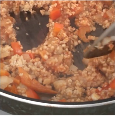 - ステップ3材料を混ぜるオートミールを入れて混ぜ、さらに、トマトソース、コンソメスープの素、スパイスを加えて、ひと煮立ちさせます。塩コショウで味を調えます。