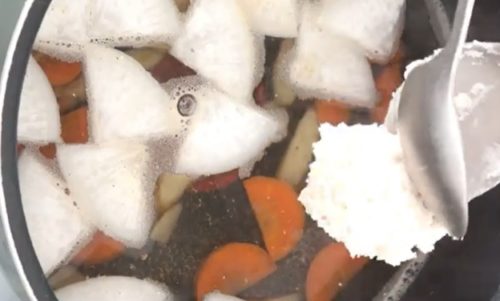 - 野菜が柔らかくなったら、すいとんをスプーンで入れていきます。すいとんが浮いてくるまで、2~3分煮ます。