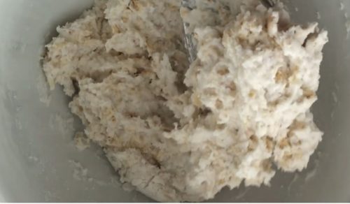 - 水1/4カップを温め、オートミールに注ぎ、ふやかします。米粉を加えて混ぜ合わせ、残りの水で固さを調節します。