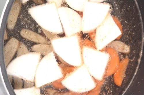 - ステップ3野菜を煮る鍋にだし汁と調味料、野菜を入れ、煮ます。