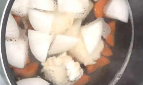 - 鍋にだし汁と調味料、野菜を入れ、煮ます。