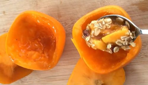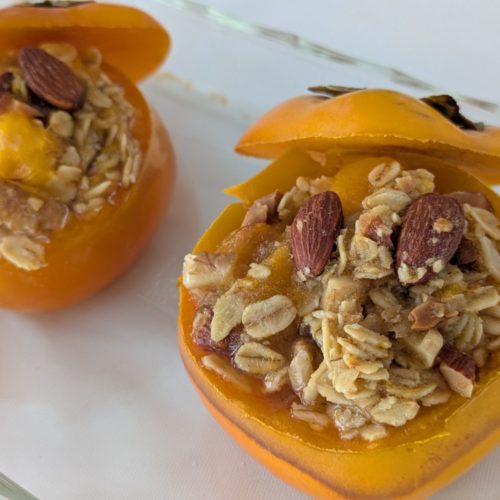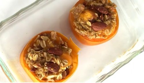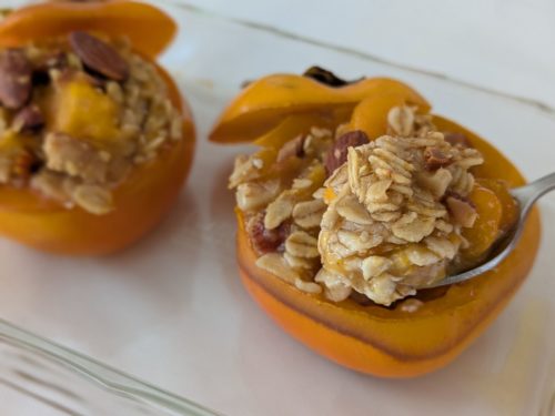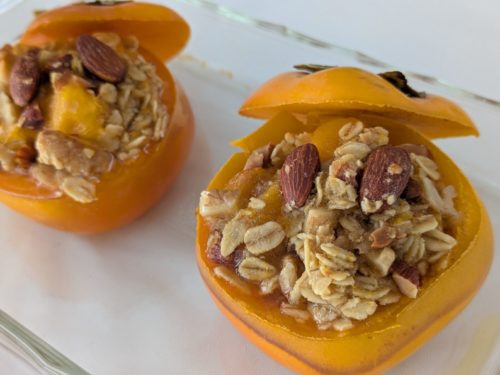 このレシピでは、柿の中身をくりぬき、その柿とオートミール、ナッツを詰めて、焼き上げます。