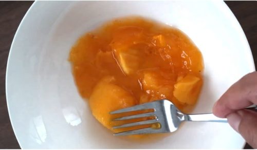 - ステップ1クランブルを作るボウルにくりぬいた柿を入れて、フォークでつぶします。