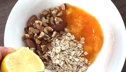 ロールドオーツ、粗く砕いたアーモンドとくるみ、ココナッツオイル、レモン汁を加え、混ぜ合わせます。