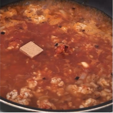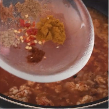 水、コンソメ、スパイスを加えて混ぜ合わせ、煮込みます。