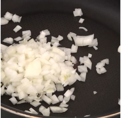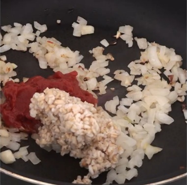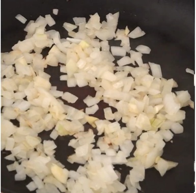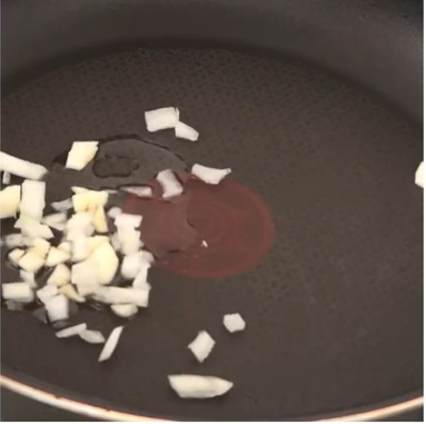 - ステップ2カレーを作るオリーブオイルをしいたフライパンで、みじん切りにしたニンニクと玉ねぎをあめ色になるまで炒めます。