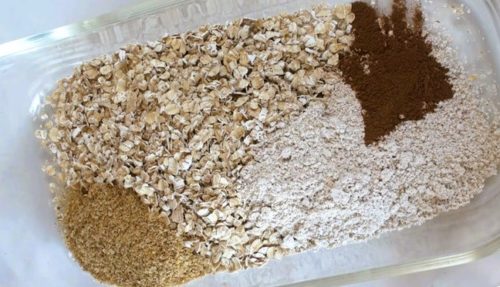 - ボウルにクイックオーツ、オーツ粉、メープルシロップ、ココナッツオイル、ヨーグルトを入れ、混ぜ合わせます。
