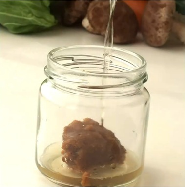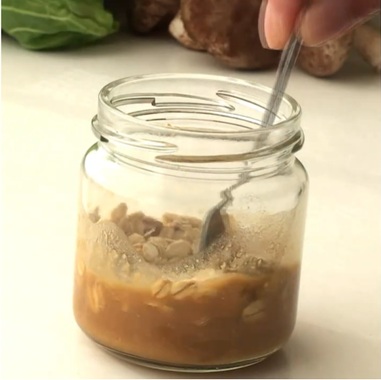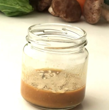 - ガラスの容器に味噌、酢、オリーブオイル、すりおろしたニンニク、オートミールを入れ、混ぜ合わせます。