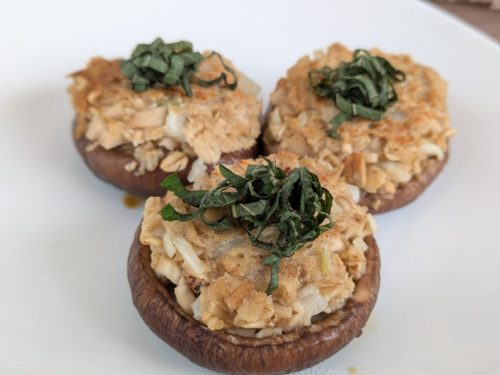 肉の代わりにオートミールをしいたけに詰め、オートミールを衣にして揚げました。