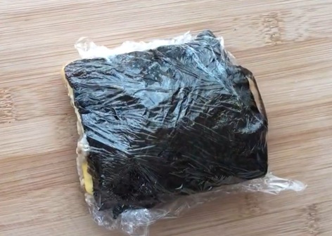 今回は、卵焼き、にんじん、しいたけの煮物を具に、折りたたみのり巻きにしました。