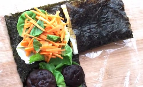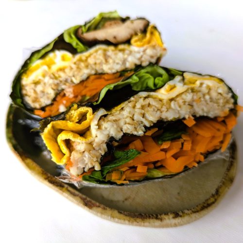 お米の代わりにスティールカットオーツを使いますが、あとは普通ののり巻きと同じ。