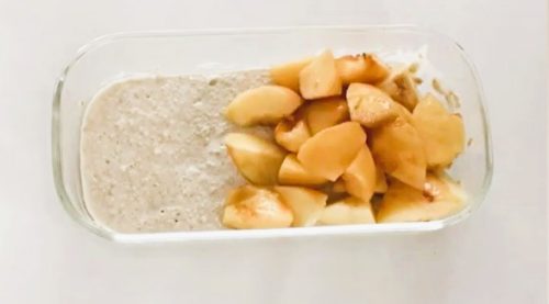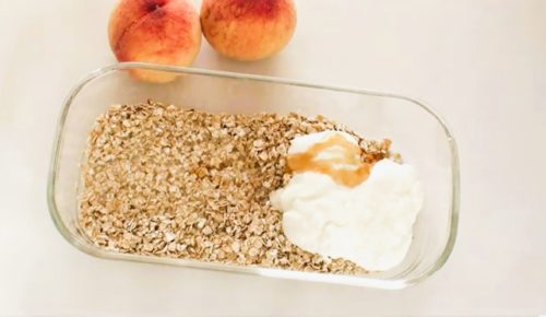 • できあがったオーバーナイトオーツに乱切りした桃を加えて混ぜます。