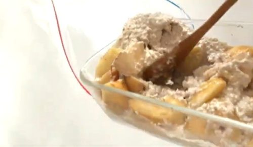 オーバーナイトオーツに桃を加え、チャック付き袋に入れて冷凍する簡単レシピ。