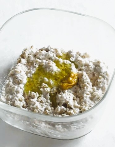 - 前日の夜に、オートミールとヨーグルトを容器に入れて、蓋をし、冷蔵庫でひと晩(8時間程度)おきます。