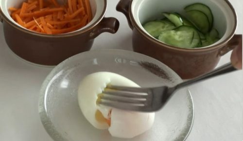- きゅうりとにんじんを切り、それぞれ塩もみします。ゆで卵を作り、フォークでくずします。
