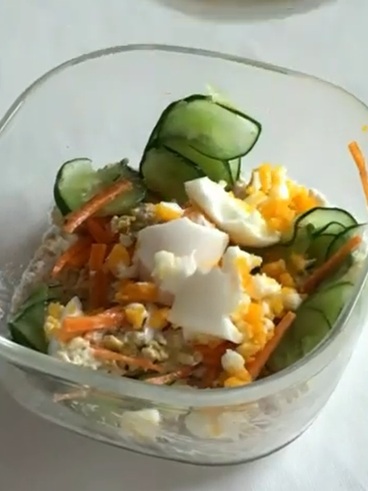 - オーバーナイトオーツにオリーブオイル、塩、マスタードを混ぜます。さらに、きゅうりとにんじん、ゆで卵を加えてよく混ぜ合わせます。