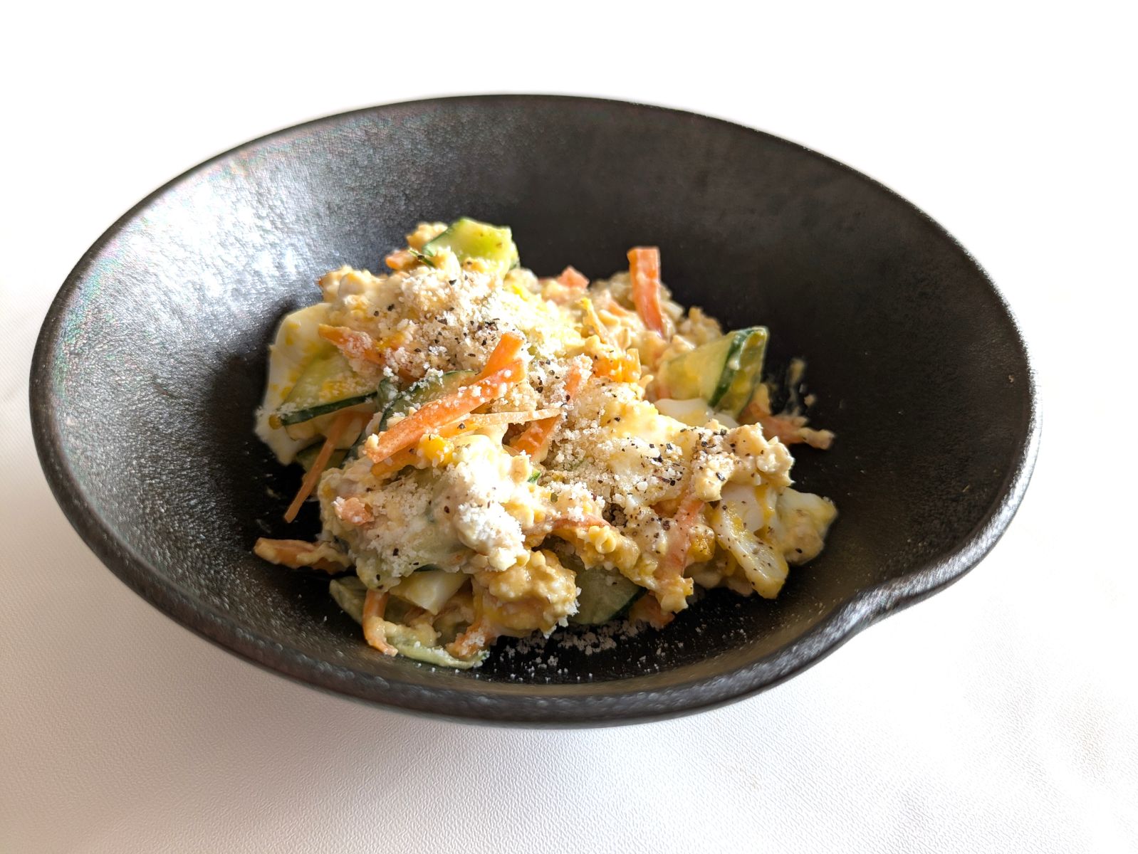 オートミールとヨーグルトのオーバーナイトオーツに、きゅうりとにんじん、ゆで卵を混ぜただけ。粉チーズも加え、ボリュームたっぷりで、主食のごはんにもなるサラダです。
