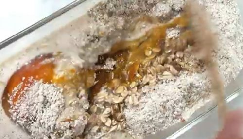 • オーツ粉、ロールドオーツ、卵、豆乳、メープルシロップ、シナモン、重曹を混ぜ合わせます。