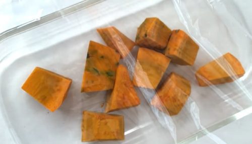• 皮と種とワタを取り除たかぼちゃを一口大に切り、耐熱ボウルに入れてラップをかけ、600Wの電子レンジで5分〜7分加熱します。かぼちゃが温かいうちにフォークでなめらかになるまで潰します。