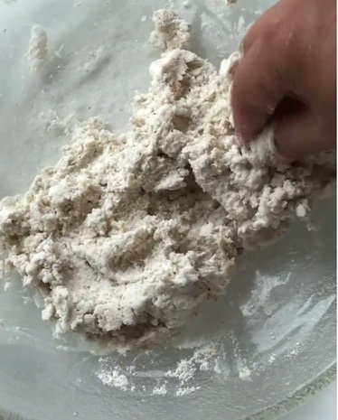 ボウルにオーツ粉と米粉を入れ、ぬるま湯を少しずつ注いで混ぜ、耳たぶのかたさにします。